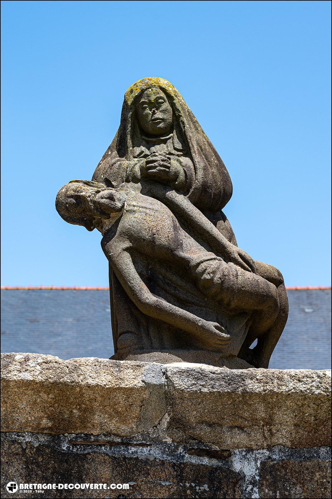 Le mouvement du corps du Christ tournant sur les genoux de la Vierge est caractéristique de cette statue, l’une des nombreuses pietà de Bretagne.